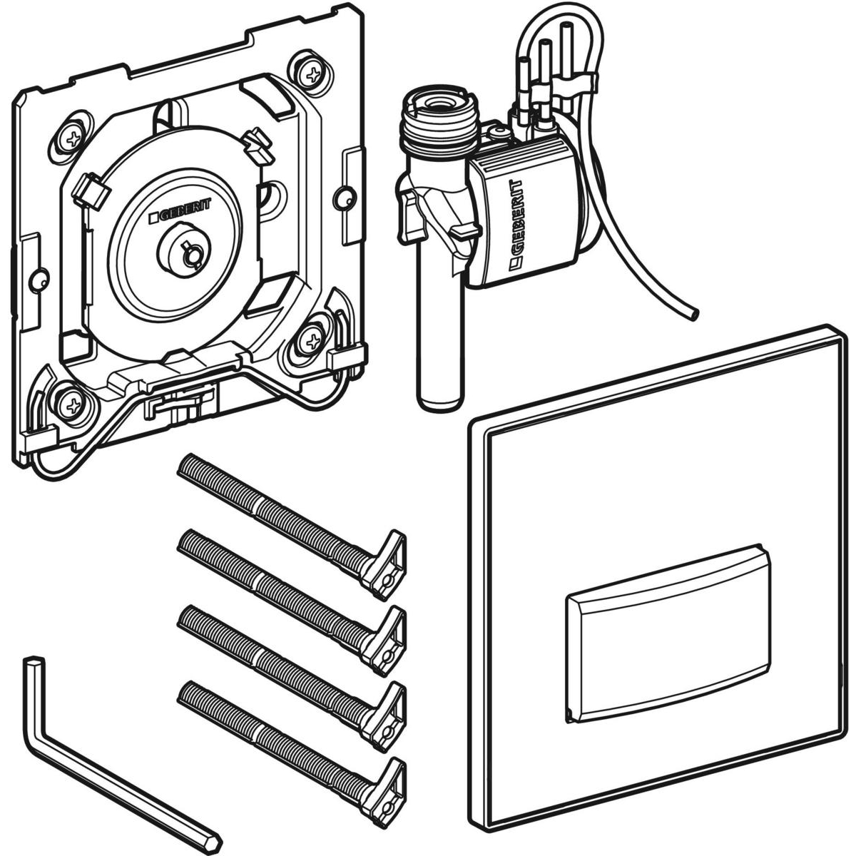 Przycisk uruchamiający z ryglem zabezpieczającym Ustawianie czasu spłukiwania za pomocą dysz powietrza (pneumatycznie) Niewielka siła nacisku uruchamia spłukiwanie Zwolnienie przycisku uruchamiającego uruchamia spłukiwanie Możliwość zredukowania ilości spłukiwanej wody poprzez zestaw montażowy regulatora przepływu do 0,5 l na spłukanie Poziom hałasu armatury Grupa II, zgodnie z DIN 4109 Do ręcznego uruchamiania spłukiwania pisuarów Do stelaży podtynkowych Geberit do pisuaru z uruchamianiem z przodu Do stelaży podtynkowych Geberit do pisuaru z uruchamianiem od góry Do montażu w skrzynkach montażowych do zaworów spłukujących Geberit do pisuaru (produkowanych od 2009 roku) Kolor główny: Piaskowy szary Powierzchnia: Szkło