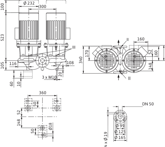 Pompa podwójna Inline z dwiema jednostopniowymi dławnicowymi pompami wirowymi we wspólnym korpusie z klapą przełączającą, do montażu na rurociągu lub do ustawienia na fundamencie. Kołnierz zaślepiający na korpusie i konsole za dopłatą. Odporna na drgania, zapewniająca cichą pracę konstrukcja blokowa z latarnią i sztywno połączonym standardowym silnikiem kołnierzowym (silnik odpowiadający normom). Z niezależnym od kierunku obrotów mieszkowym uszczelnieniem mechanicznym z wymuszonym opływem oraz wirnikiem redukującym kawitację. Kołnierze z przyłączami pomiarowymi ciśnienia R 1/8. Korpus pompy i latarnia z powłoką kataforetyczną. W wersji standardowej silniki w klasie IE3. Pompy z silnikami ≥ 5,5 kW są seryjnie wyposażone w czujniki termistorowe jako zabezpieczenie silnika. Skrzynia zaciskowa do silnika ≤ 7,5 kW może być wykonana z metalu lub tworzywa sztucznego. Jeśli bezwzględnie wymagana jest metalowa skrzynia zaciskowa, należy zamówić odpowiedni wariant specjalny. Skrzynie zaciskowe