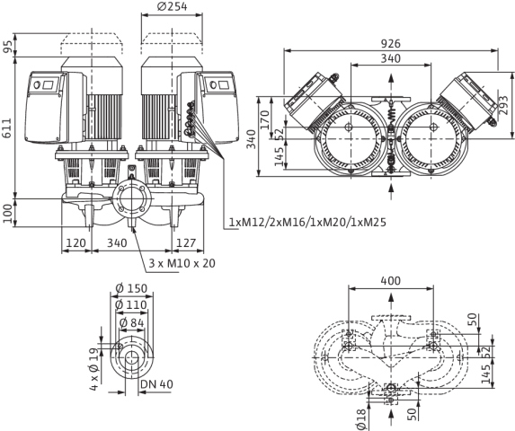 Dławnicowa pompa podwójna o konstrukcji Inline do montażu na rurociągu lub do ustawienia na fundamencie z wbudowaną przetwornicą częstotliwości do regulacji elektronicznej m.in. wg stałej i zmiennej różnicy ciśnień (Δp-c/Δp-v)