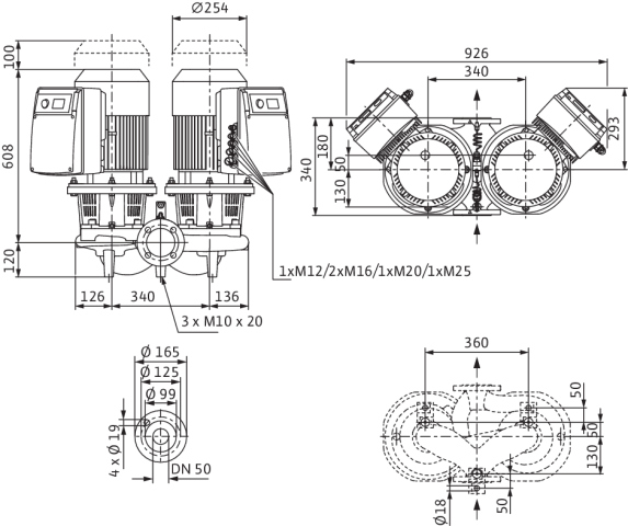 Pompa obiegowa WILO CronoTwin-DL-E 50/160-5,5/2-R1-S1 typu in-line z silnikiem znormalizowanym 50/60 Hz, moc silnika 5.5kW 10.6 A 2900 obr/min, wlot Kołnierz DN 50