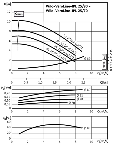 Pompa obiegowa WILO VeroLine-IPL 25/70-0,12/2 typu in-line z silnikiem znormalizowanym 50 Hz, moc silnika 0.12kW 0.33 A 2780 obr/min, wlot GZGW 1 1/2''