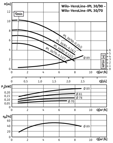 Pompa obiegowa WILO VeroLine-IPL 30/70-0,12/2 typu in-line z silnikiem znormalizowanym 50 Hz, moc silnika 0.12kW 0.33 A 2780 obr/min, wlot GZGW 2''