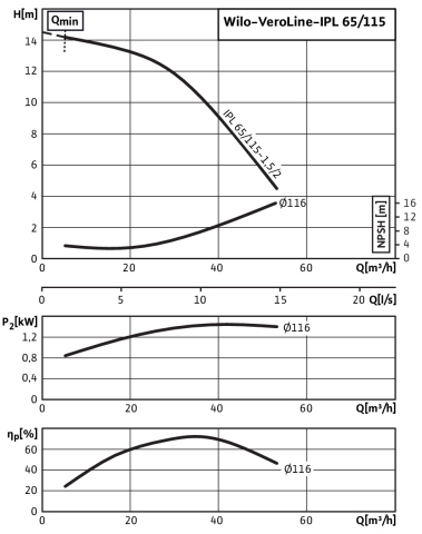 Pompa obiegowa WILO VeroLine-IPL 65/115-1,5/2-IE3 typu in-line z silnikiem znormalizowanym 50 Hz, moc silnika 1.5kW 3.18 A 2900 obr/min, wlot Kołnierz DN 65