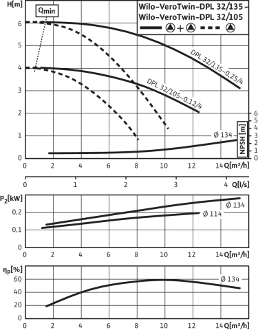 Pompa obiegowa WILO VeroTwin-DPL 32/135-0,25/4 typu in-line z silnikiem znormalizowanym 50 Hz, moc silnika 0.25kW 0.69 A 1450 obr/min, wlot Kołnierz DN 32