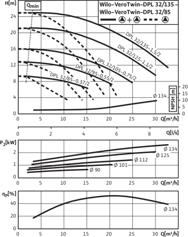 Pompa obiegowa WILO VeroTwin-DPL 32/95-0,55/2 typu in-line z silnikiem znormalizowanym 50 Hz, moc silnika 0.55kW 1.33 A 2900 obr/min, wlot Kołnierz DN 32
