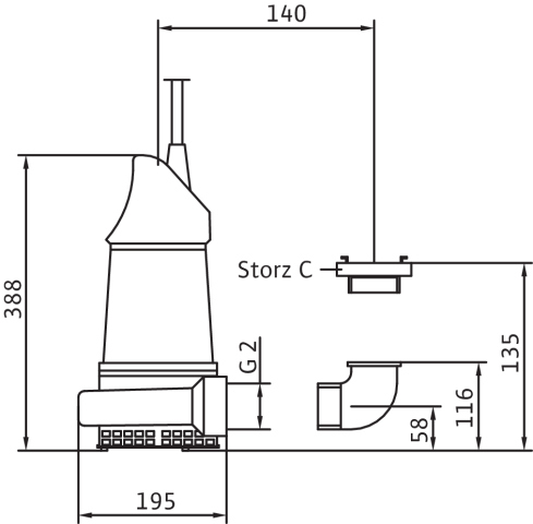 Całkowicie zanurzona pompa zatapialna do wody zanieczyszczonej, pionowe ustawienie mokre, do tłoczenia wody zanieczyszczonej i zawierającej piasek Korpus hydrauliczny i wirnik z żeliwa szarego, korpus silnika z aluminium. Przyłącze tłoczne z pionowym odpływem ciśnieniowym i złączem typu Storz. Samochłodzący silnik w wersji na prąd zmienny jednofazowy, z odłączanym kablem zasilającym i wyłącznikiem pływakowym z wtyczką z uziemieniem i kondensatorem roboczym. Do uszczelnienia po stronie medium i silnika służy uszczelnienie mechaniczne. Agregat można stosować w podsysającym trybie pracy bez ograniczeń.