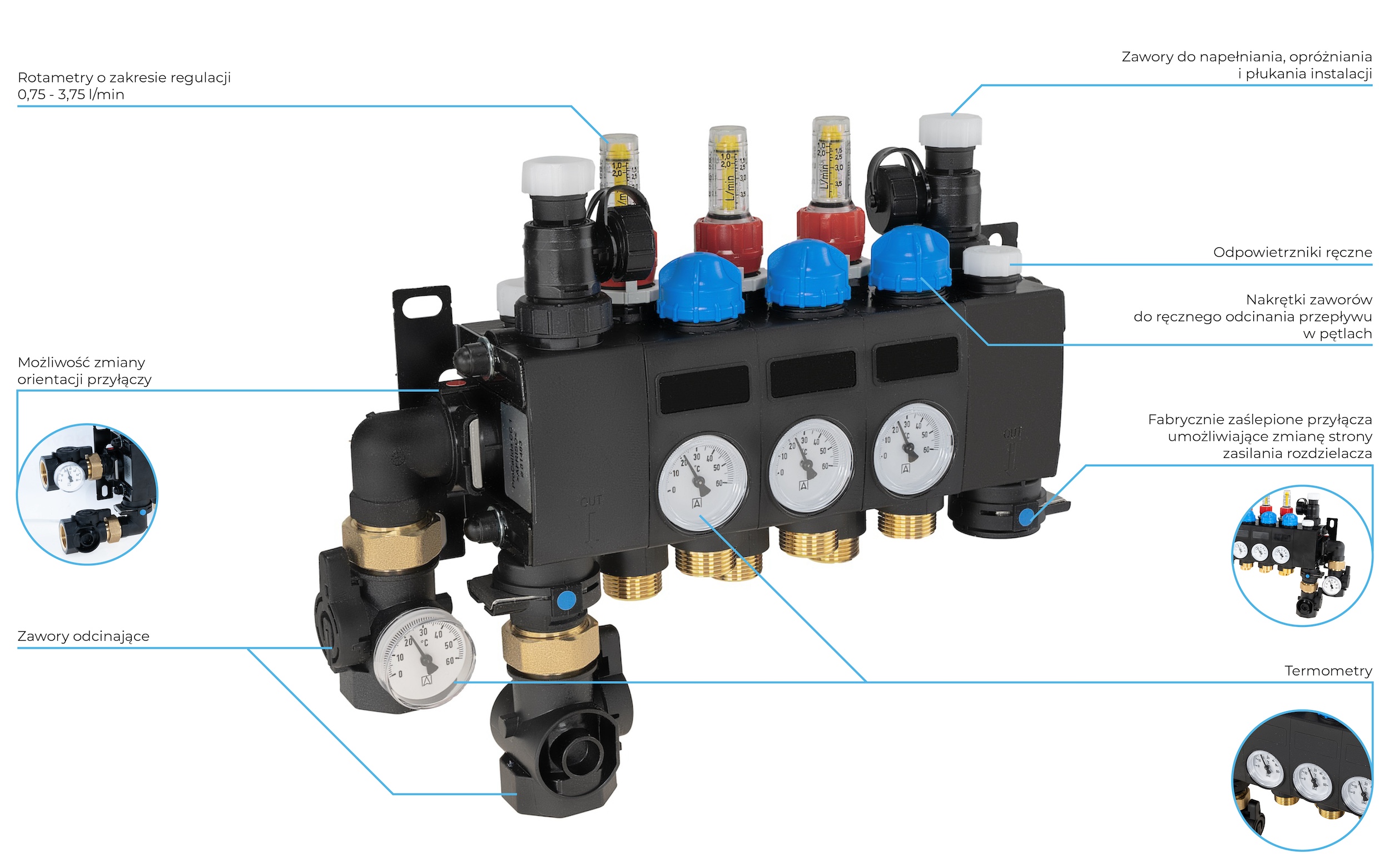 Poliamidowe zawory odcinające ułatwiają pracę konserwacyjne oraz napełnianie oraz płukanie pętli. Zawór na zasilaniu posiada termometr.
