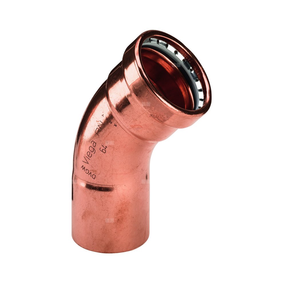 Profipress XL-łuk 45°, z SC-Contur, miedź, końcówka wsuwana, przyłącze zaprasowywane. Wyposażenie: Element uszczelniający EPDM, pierścień nacinający, pierścień oddzielający, nr wzoru 2426.1XL, nr kat. 476 946, d: 88,9