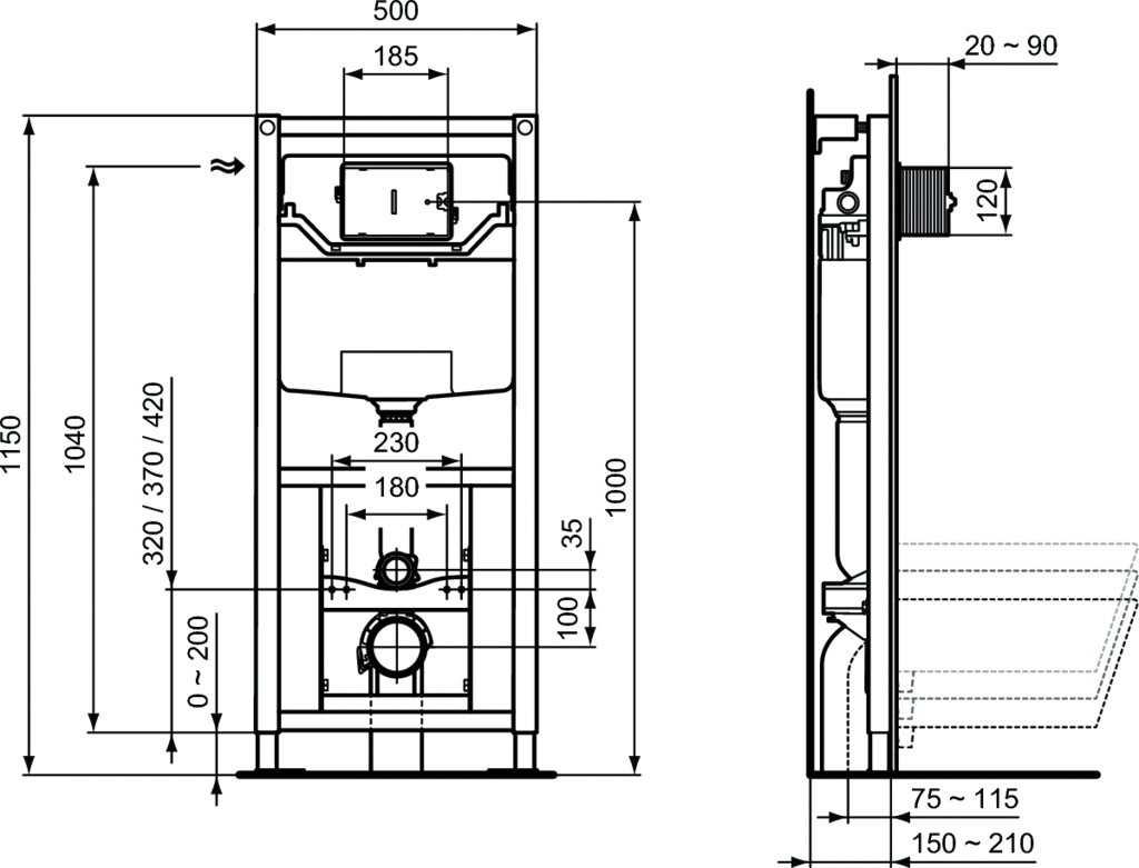 Do miski wiszącej WC, z regulacją wysokości. Stelaż z regulacją wysokości na 3 poziomach pozwalający zmienić wysokość miski (320/370/420 mm od mocowań do podłogi) przed zabudową stelaża ścianą. Podtynkowa instalacja, montaż do ściany. Stelaż testowany na obciążeniu 400 kg. Rama zabezpieczona i odporna na korozję. Szybka instalacja z systemem EasyFix. Regulacja głąbokości montażu i kierunku kolana rury odpływowej. Wsporniki z blokadą ułatwiającą montaż i regulacją wysokości w zakresie od 0 do 200 mm. Minimalna głębokość montażu 150 mm. Mechaniczny system spłukujący, możliwość zastosowania pneumatycznego lub elektronicznego systemu spłukującego (wraz z zamawianym oddzielnie zestawem do montażu przycisku). Spłukiwanie 2 funkcyjne, fabryczne ustawienie 6/3 l. Regulacja spłukiwania: 4/2 i 6/3 l. Zbiornik spłukujący wykonany z polipropylenu (PP), odporny na temperaturę, wyposażony w obudowę antykondensacyjną. Zawór SmartValve (oszczędność do 9 l wody/dzień), oznaczenie CE EN 14055 CL1, cichy zawór, zgodny ze standardami NF, klasa akustyczna pracy I, głębokość zbiornika 120 mm, 2 punktów przyłącza wody. Elementy w komplecie: Standardowy zestaw montażowy do miski. Kompletny zestaw montażowy do stelaża, wraz ze wspornikami ściennymi. Komplet przyłączeniowy do miski WC (rura odpływowa i dopływowa). Kolano odpływowe i adapter ø90/110. Gumowa uszczelka do miski ø 45. Zaślepka montażowa do systemu spłukującego. Zawór zamykający G ½". Do skompletowania z zamawianymi oddzielnie przyciskami spłukującymi i zestawami do montażu przycisków.