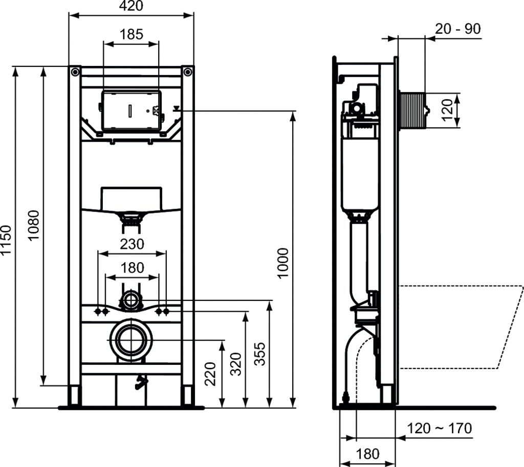 Do miski wiszącej WC, wolnostojący, mechaniczny s. spłukujący. Podtynkowa instalacja, montaż do posadzki. Wsporniki mocowania do posadzki z dwoma punktami montażu. Stelaż testowany na obciążeniu 400 kg. Rama zabezpieczona i odporna na korozję. Szybka instalacja z systemem EasyFix. Regulacja głąbokości montażu i kierunku kolana rury odpływowej. Wsporniki z blokadą ułatwiającą montaż i regulacją wysokości w zakresie od 0 do 200 mm. Minimalna głębokość montażu 180 mm. Mechaniczny system spłukujący, możliwość zastosowania pneumatycznego lub elektronicznego systemu spłukującego (wraz z zamawianym oddzielnie zestawem do montażu przycisku). Spłukiwanie 2 funkcyjne, fabryczne ustawienie 6/3 l. Regulacja spłukiwania: 4/2 i 6/3 l. Zbiornik spłukujący wykonany z polipropylenu (PP), odporny na temperaturę, wyposażony w obudowę antykondensacyjną. Zawór SmartValve (oszczędność do 9 l wody/dzień), oznaczenie CE EN 14055 CL1, cichy zawór, zgodny ze standardami NF, klasa akustyczna pracy I, głębokość zbiornika 120 mm, 2 punktów przyłącza wody. Elementy w komplecie: Standardowy zestaw montażowy do miski. Kompletny zestaw montażowy do stelaża, wraz ze wspornikami ściennymi. Komplet przyłączeniowy do miski WC (rura odpływowa i dopływowa). Kolano odpływowe ø90/100. Gumowa uszczelka do miski ø 45. Zaślepka montażowa do systemu spłukującego. Zawór zamykający G ½". W przypadku otworu odpływowego o śr. Ø110 mm, należy zamówić dodatkowo: Rura odpływu Ø90x90 mm RV18067. Rura redukcyjna Ø90- Ø110 mm RV18167. Do skompletowania z zamawianymi oddzielnie przyciskami spłukującymi i zestawami do montażu przycisków.