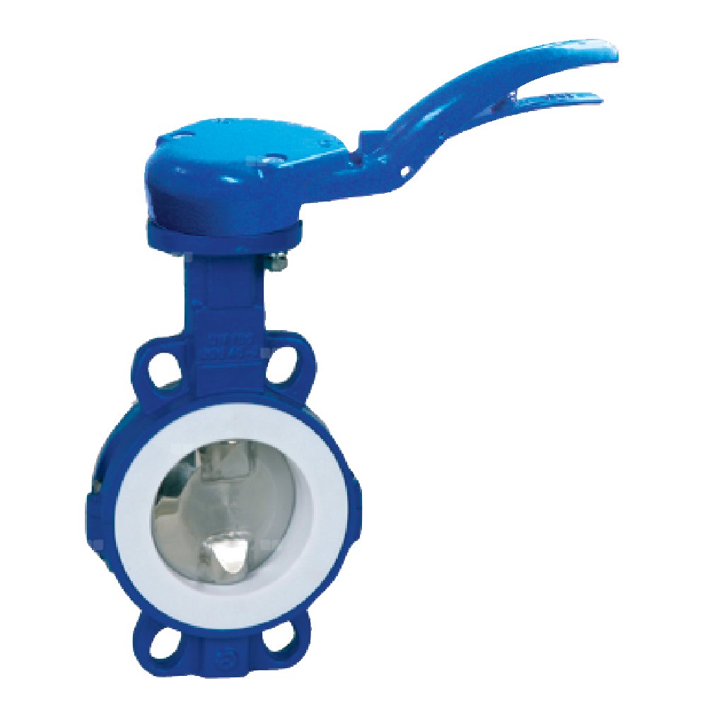 Przepustnica bezkołnierzowa LYCENE z napędem ręcznym dźwigniowym; dysk: Duplex; wykładzina: PTFE; korpus: GGG40 epoksyd.; Pnom 1,0 MPa, tmax=200°C