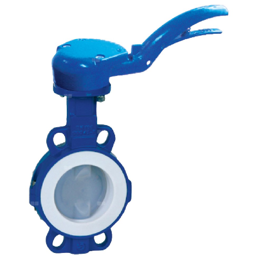Przepustnica bezkołnierzowa LYCENE z napędem ręcznym dźwigniowym, dysk: powlekany PFA, wykładzina: PTFE, korpus: GGG40 epoksyd., Pnom 1,0 MPa, tmax=200 st.C DN 125