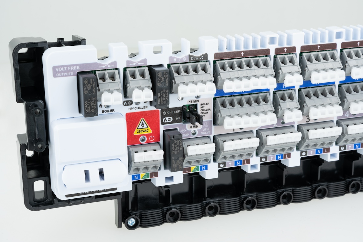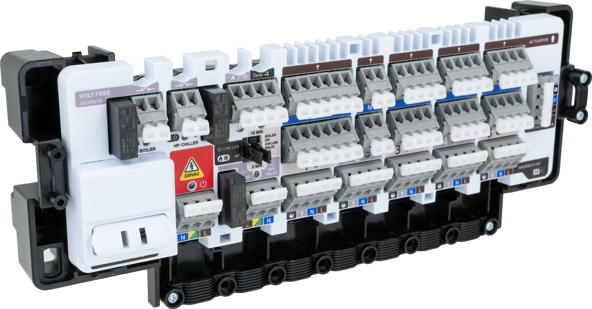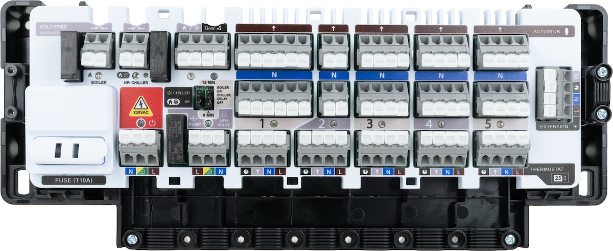 - Umożliwia podłączenie regulatorów do grzania/chłodzenia płaszczyznowego.- Łączy się z regulatorami przewodowo.