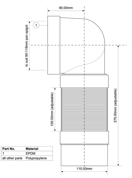 Przyłącze kanalizacyjne elastyczne, o długości od 265 do 540mm, kątowe 900 . Wejście 90-110mm z uszczelką wargową, wyjście 110mm.