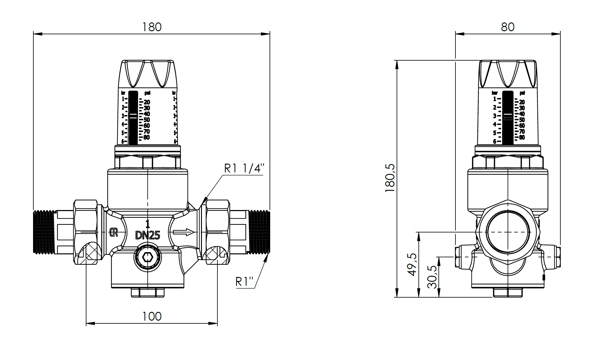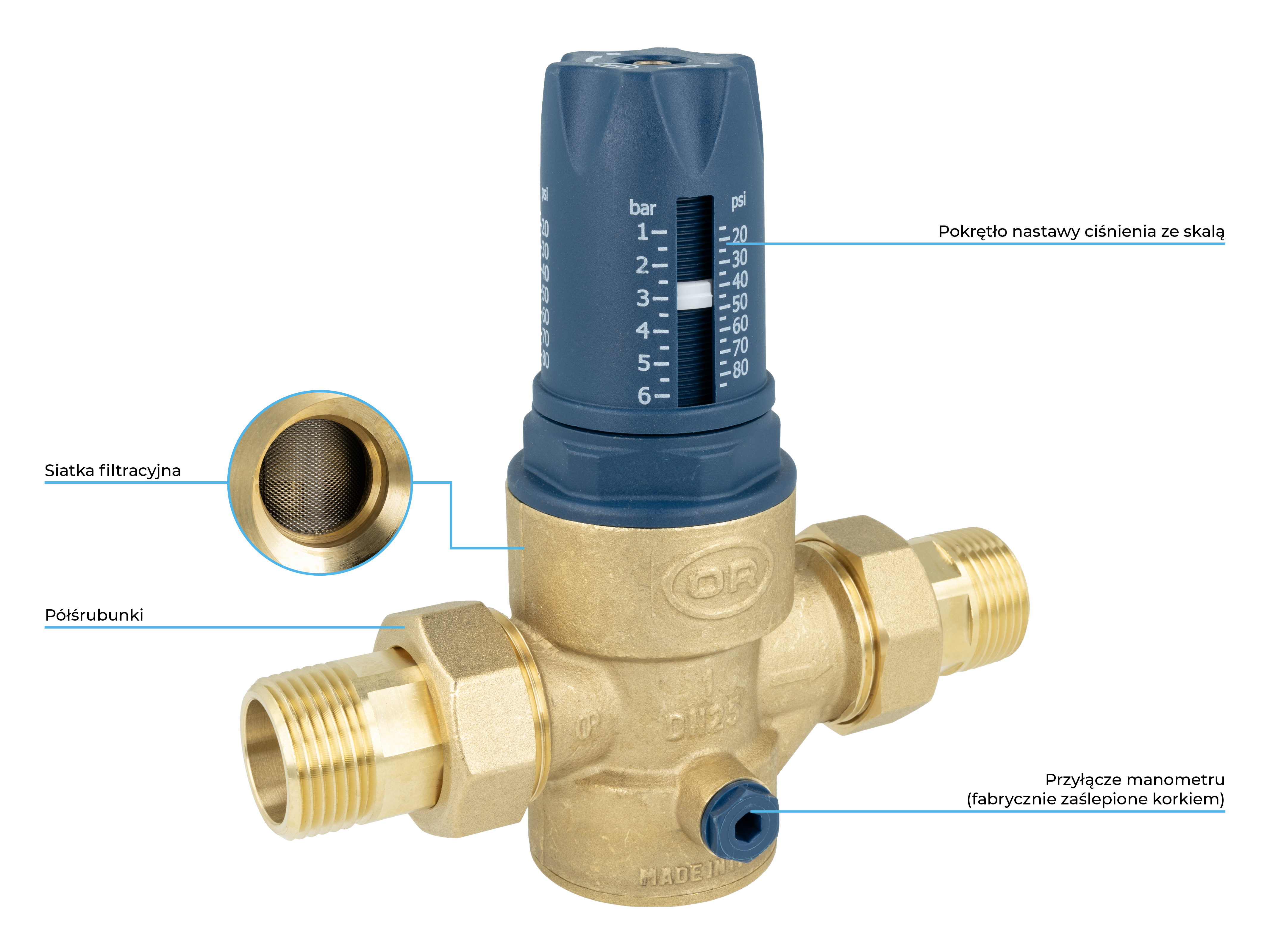 Obniża i stabilizuje ciśnienie wody do ustawionej wartości niezależnie od zmian ciśnienia na wlocie do reduktora.