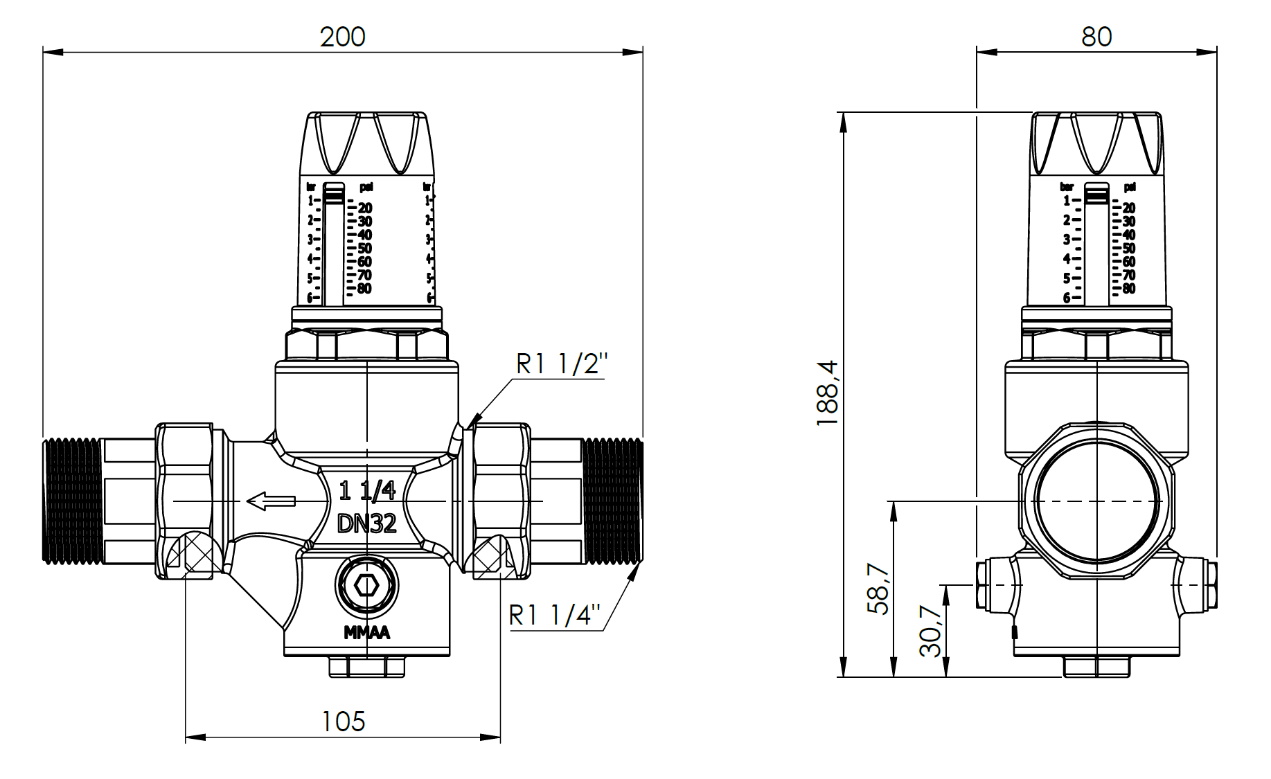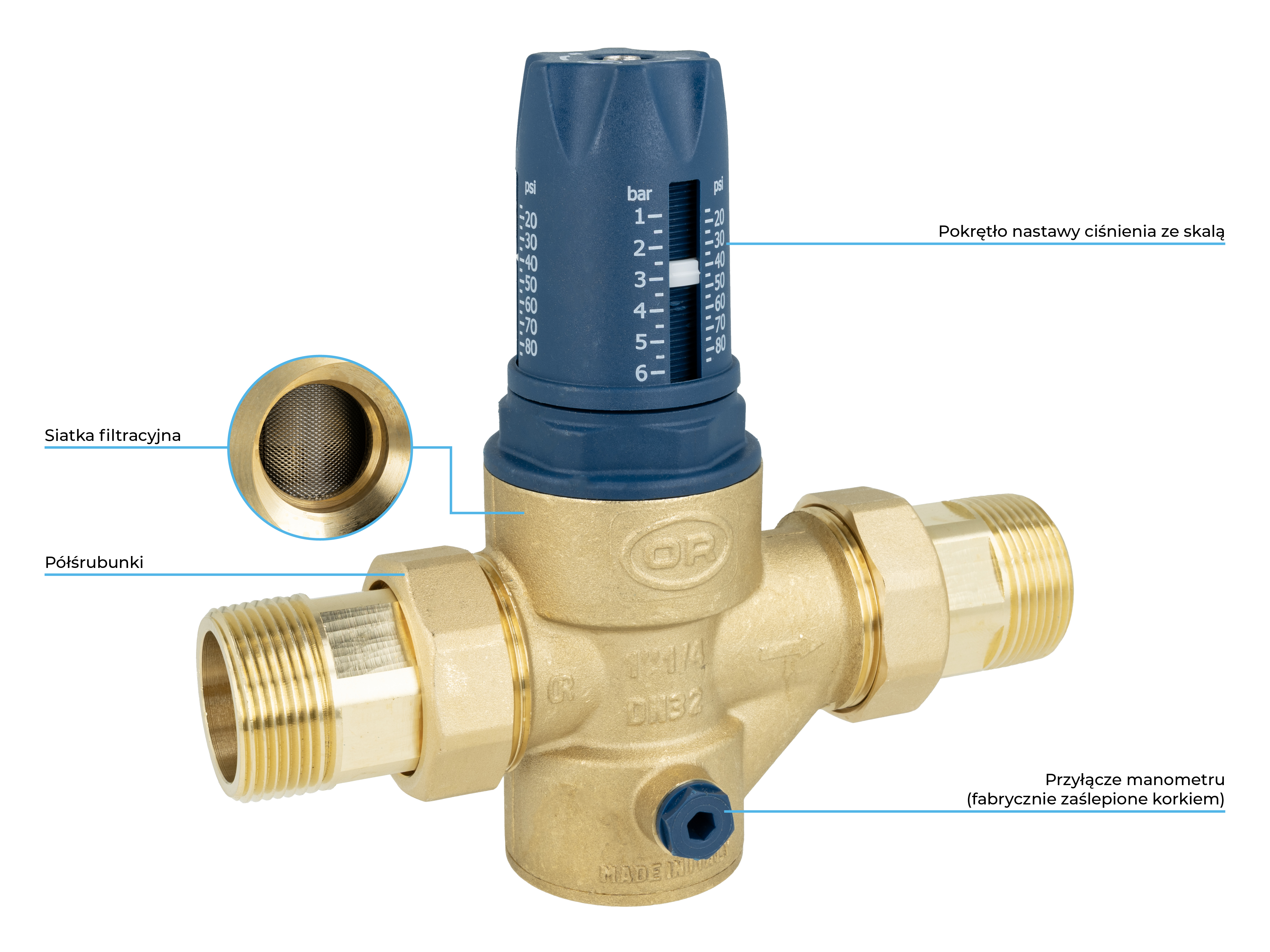 Obniża i stabilizuje ciśnienie wody do ustawionej wartości niezależnie od zmian ciśnienia na wlocie do reduktora.