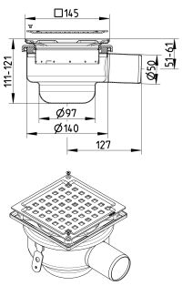 Regulowany wpust, kwadratowy 140x140 odpływ poziomyDN =50 mm, niski model, stal kwasoodporna