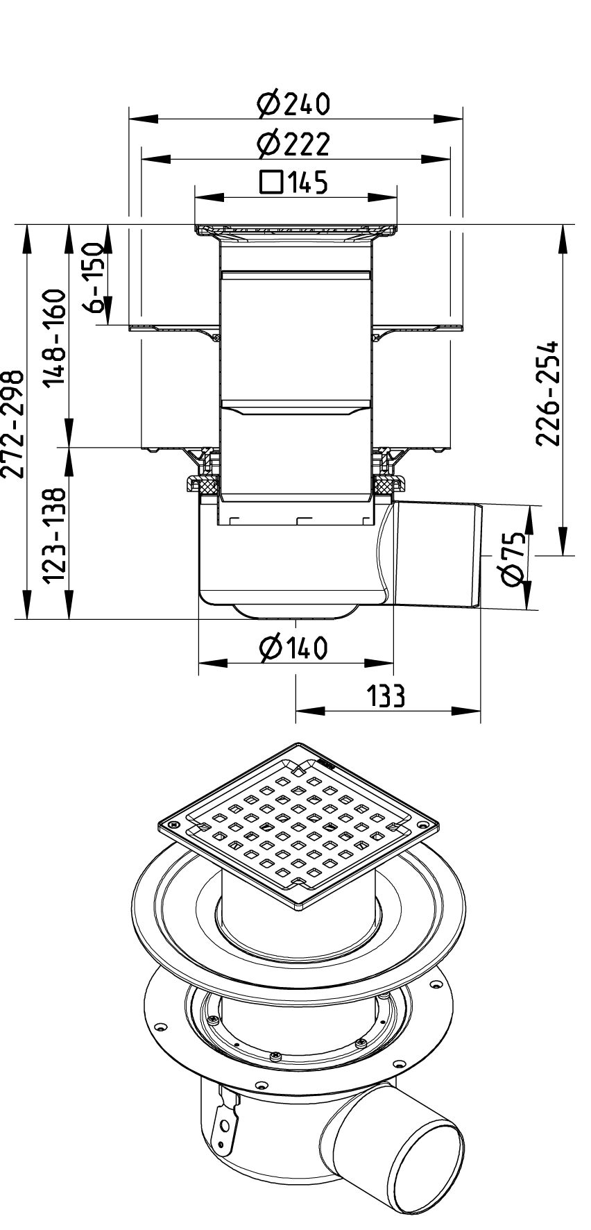 Regulowany wpust łazienkowy, odpływ poziom DN =50 mm, podwójny kołnierz
