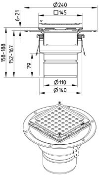 Regulowany wpust łazienkowy, ruszt kwadratowy, odpływ pion DN =110 mm, stal kwasoodporna