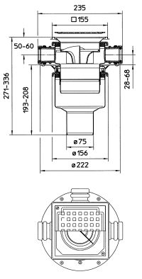 Regulowany wpust łazienkowy, ruszt kwadratowy, odpływ pion DN =75 mm, 3 dopływy boczne, stal kwasoodporna