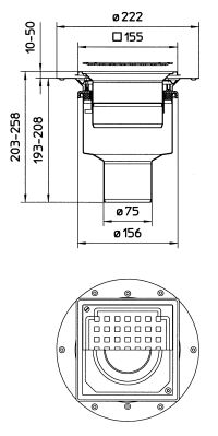 Regulowany wpust łazienkowy, ruszt kwadratowy, odpływ pion DN =75 mm, stal kwasoodporna