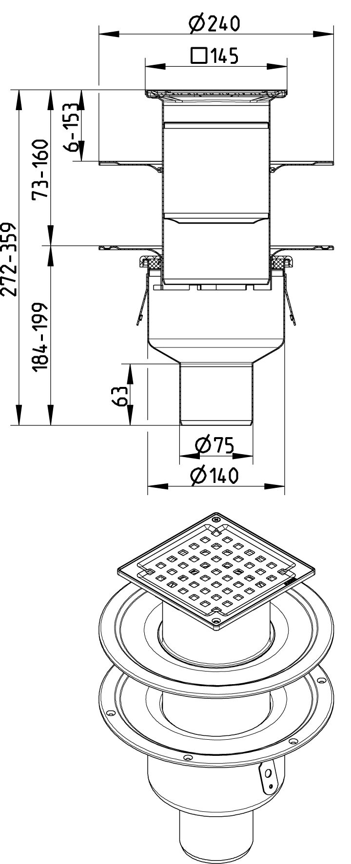 Regulowany wpust łazienkowy, ruszt kwadratowy, z podwójnym kołnierzem do izolacji, odpływ pion fi 75 mm