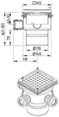 Regulowany wpust, ruszt kwadratowy, odpływ pion DN =110 mm, z 3 boczne dopływy