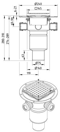 Regulowany wpust, ruszt kwadratowy, odpływ pion DN =75 mm, z 3 dopływy boczne