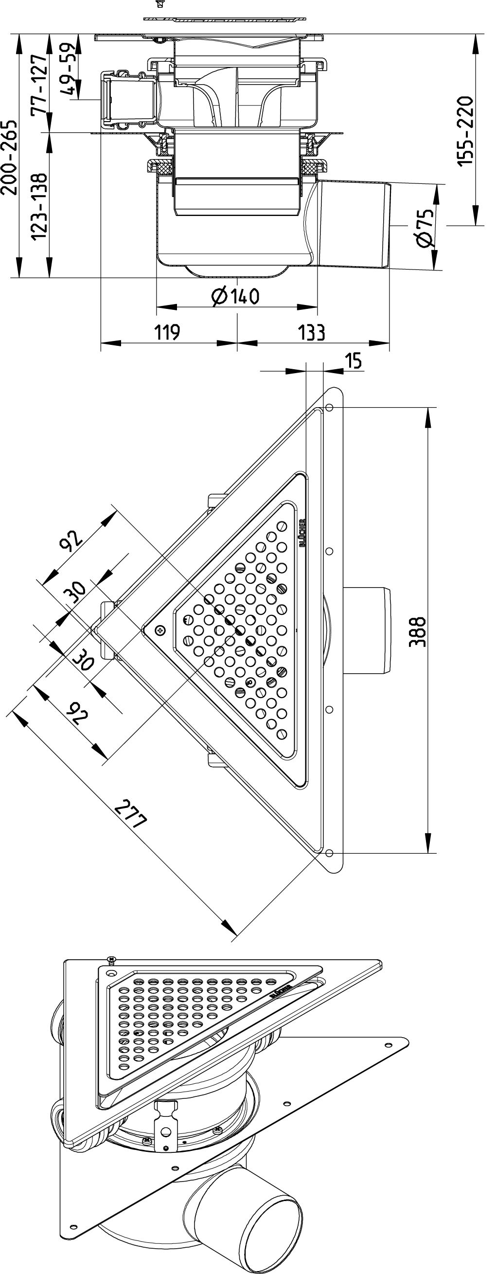 Regulowany wpust TRIO, trójkątny, odpływ poziom, odpływ DN =75 mm, z kołnierzem do izolacji, z bocznym dopływem