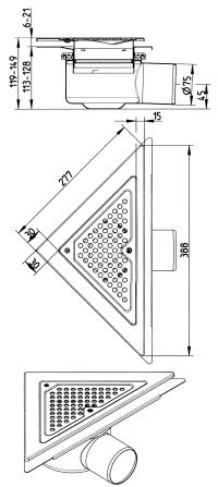 Regulowany wpust TRIO, trójkątny, odpływ poziom, odpływ DN =75 mm, z kołnierzem do izolacji