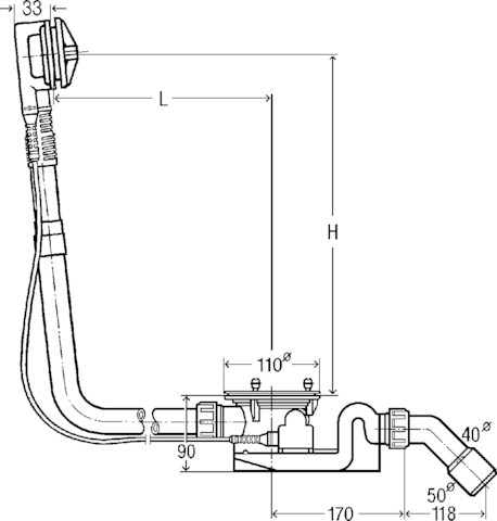 Rotaplex-komplet odpływowo-przelewowy jednostka funkcyjna wyposażenie, Syfon, łuk odpływowy 45 st., nr wzoru 6142.32 DN: 40/50 długość cięgna Bowdena: 725 L: 150–400 H: 180–430 wanna z odpływem pośrodku do wanien z otworem odpływowym fi 90