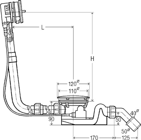 Rotaplex Trio-komplet odpływowo-przelewowy Visign RT3 nr wzoru 6141.71 DN: 40/50 długość cięgna Bowdena: 1070 L: 150–680 H: 180–480 wanna o długości niestandardowej do wanien z otworem odpływowym fi 90