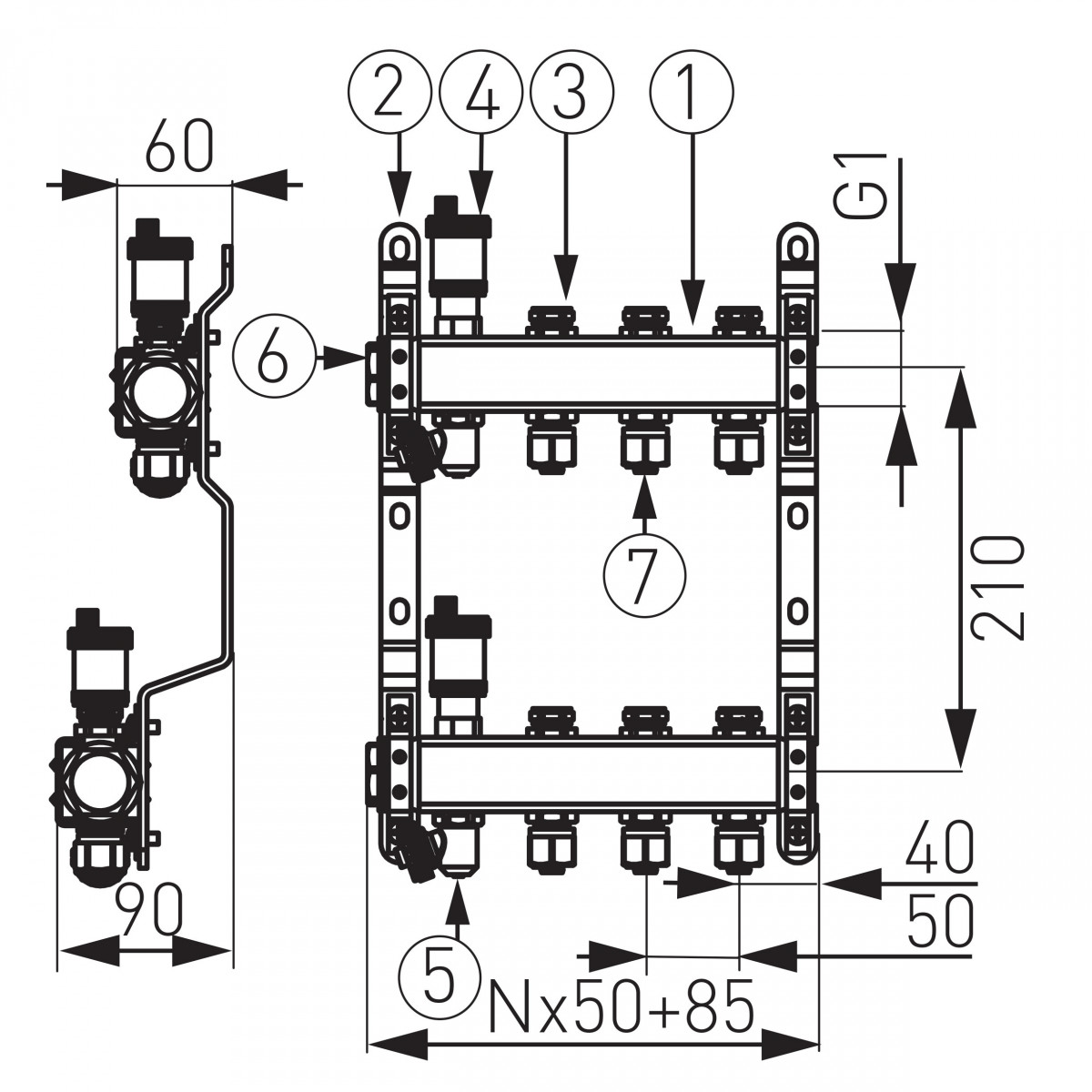 Rozdzielacz 6-drogowy (do systemów c.o. i c.w.u.) z zaworami odcinającymi obwody, ze złączkami, stal nierdzewna