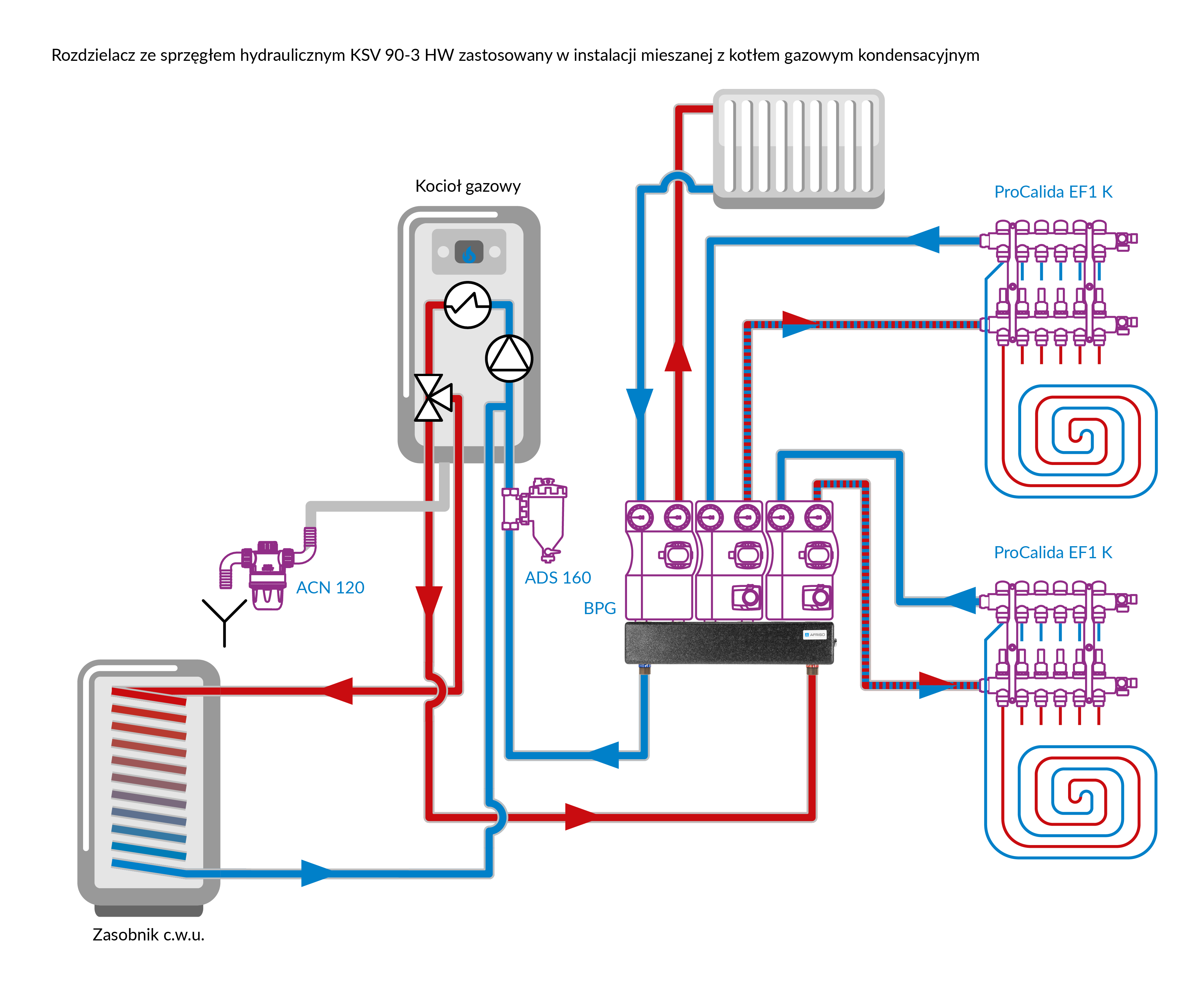- Stosowany w instalacjach grzewczych i chłodzących.- Montowany na ścianie pomiędzy źródłem ciepła lub chłodu a grupami pompowymi.