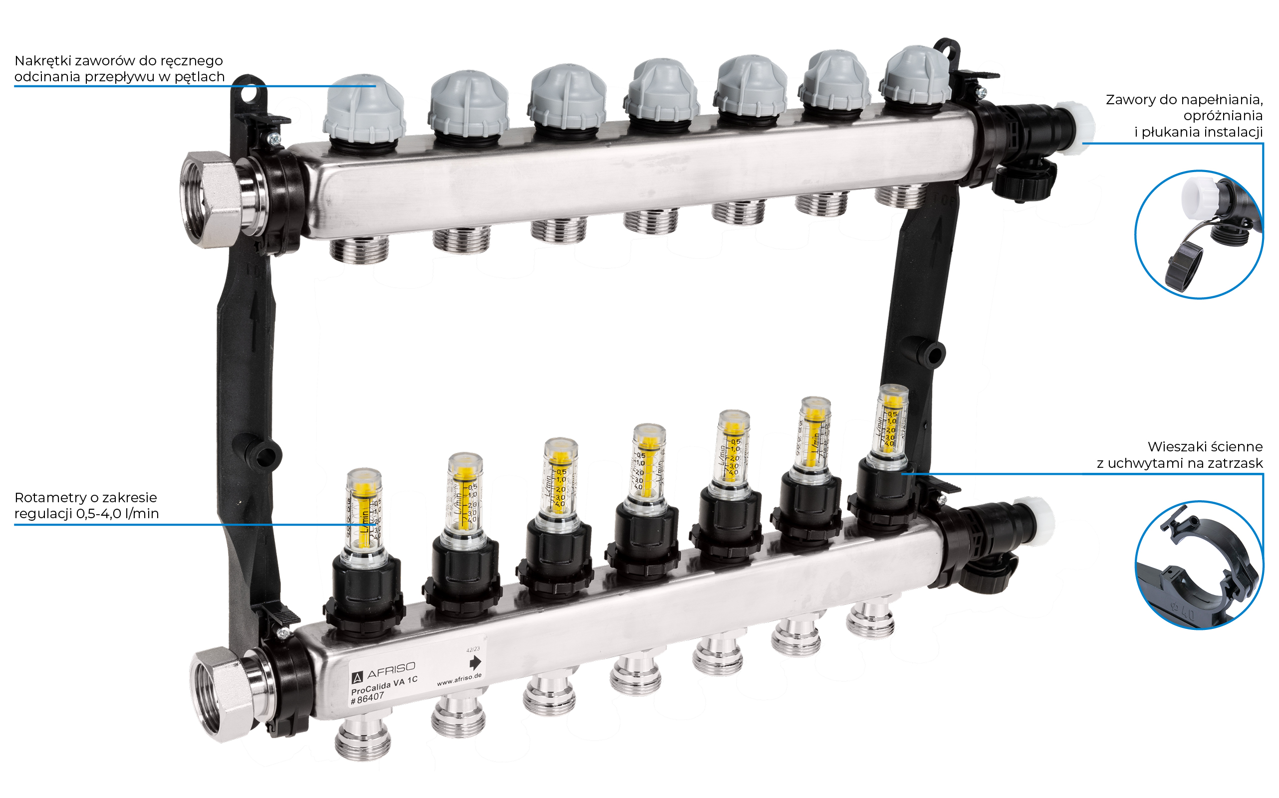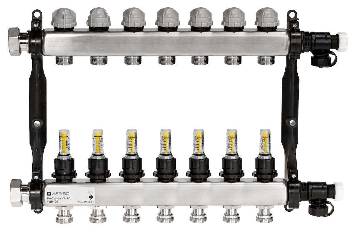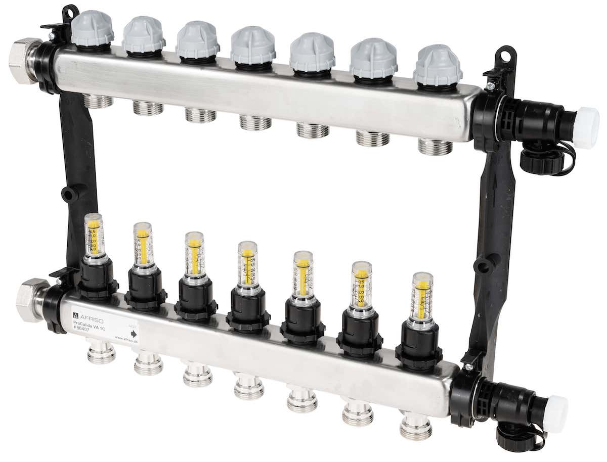Rozdzielacz do ogrzewania podłogowego AFRISO ProCalida VA 1C 7-obieg. stal nierdzewna GZ 1'' x euroconus 3/4''