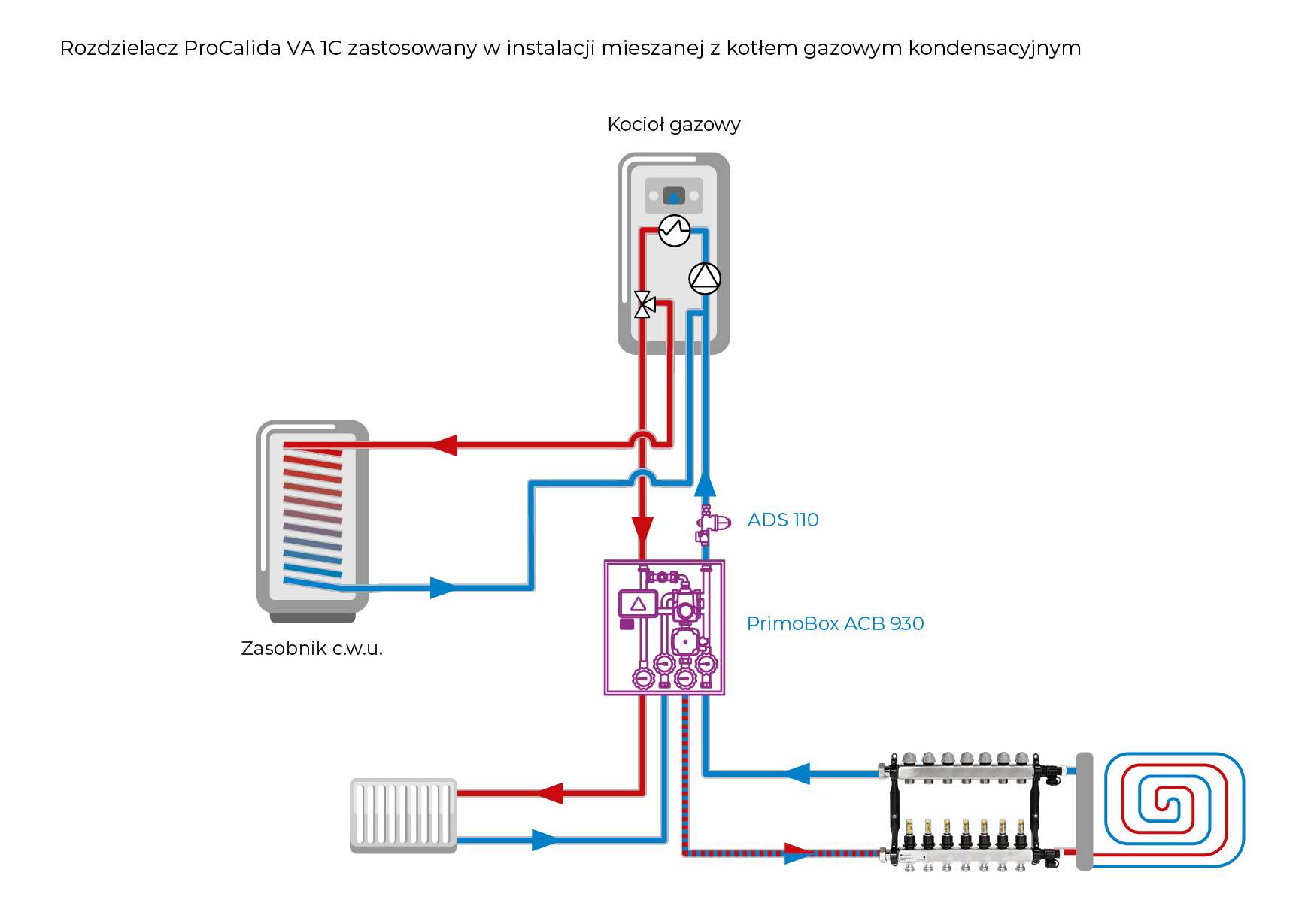 Rozprowadza ciepło/chłód ze źródła na poszczególne pętle instalacji płaszczyznowej.