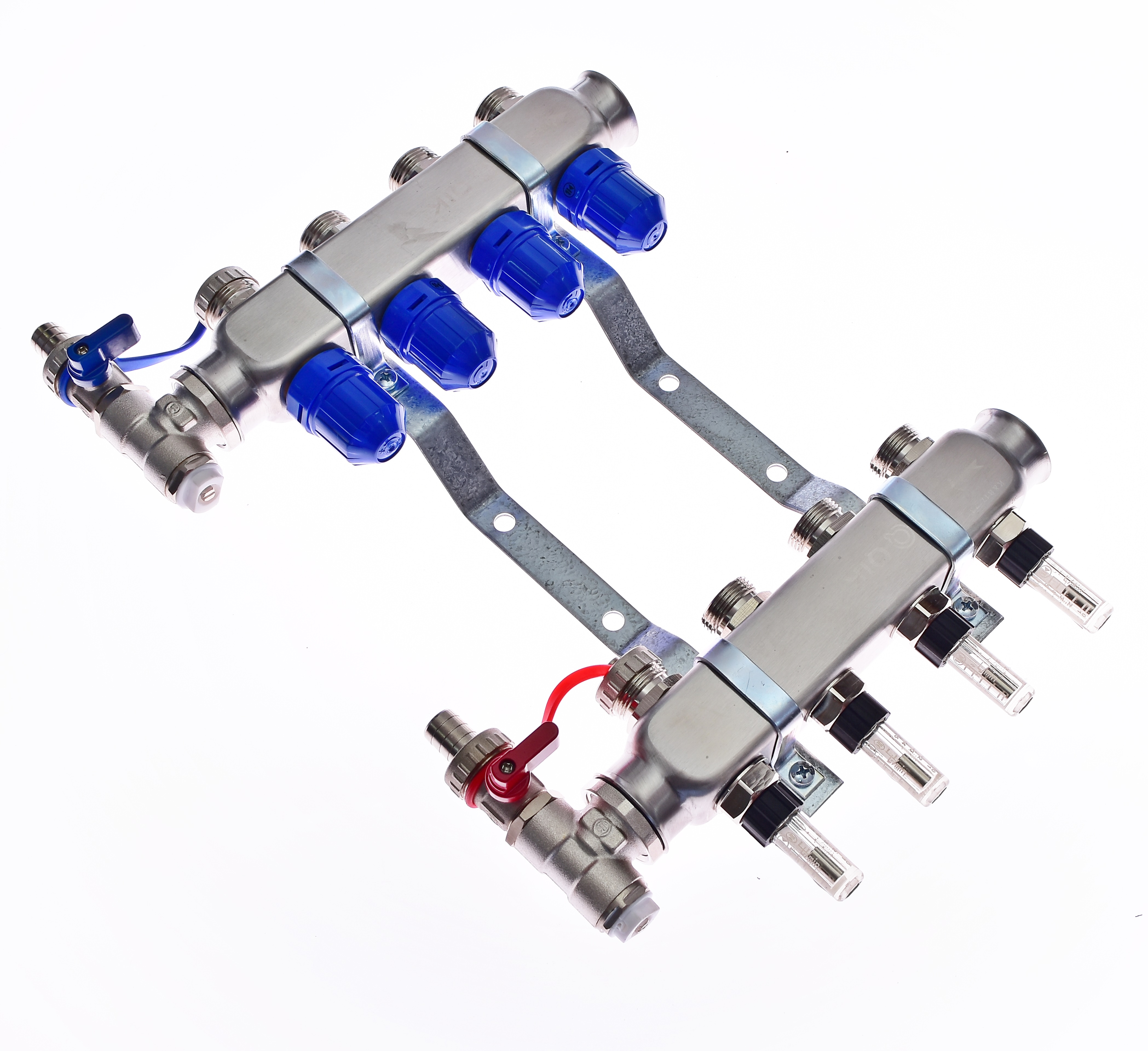 Rozdzielacze ogrzewania podłogowego, przeznaczone do rozdzielenia medium grzew­czego na poszczególne pętle. Belki INOX profilowe, w skład kompletu wchodzi: • rotametry magnetyczne na belce zasilającej o zakresie przepływu 0-5 l • termostatyczne zawory regulacyjne ręczne z pokrętłem, pod siłowniki M30x1,5 • uchwyty montażowe z płaskownika o grubości 3mm z amortyzatorami - 2 szt. • nyple GZ 3/4" z o-ringiem o rozstawie 50mm • korki 1" pod klucz z o-ringiem - 2 szt. • zawory spustowe - 2 szt. • odpowietrzniki ręczne - 2 szt.