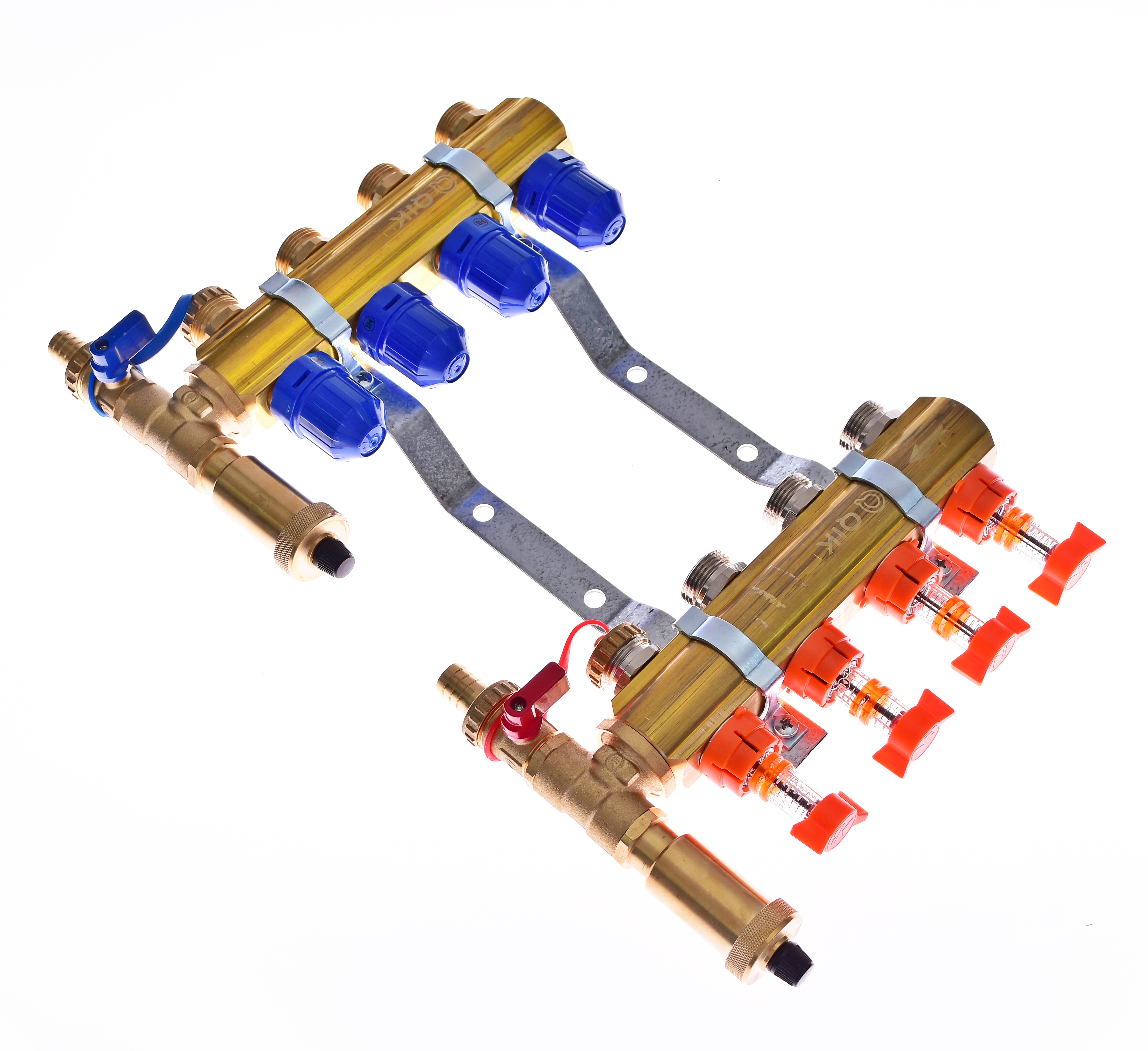 Rozdzielacze ogrzewania podłogowego, przeznaczone do rozdzielenia medium grzew­czego na poszczególne pętle. Belki mosiężne profilowe 1" o wysokości profilu 39mm, w skład kompletu wchodzi: • rotametry na belce zasilającej o zakresie przepływu 0-5 l • termostatyczne zawory regulacyjne ręczne z pokrętłem, pod siłowniki M30x1,5 • uchwyty montażowe z płaskownika o grubości 3mm z amortyzatorami - 2 szt. • nyple GZ 3/4" z o-ringiem o rozstawie 50mm • korki 1" pod klucz z o-ringiem - 2 szt. • zawory spustowe - 2 szt. • odpowietrzniki automatyczne - 2 szt.