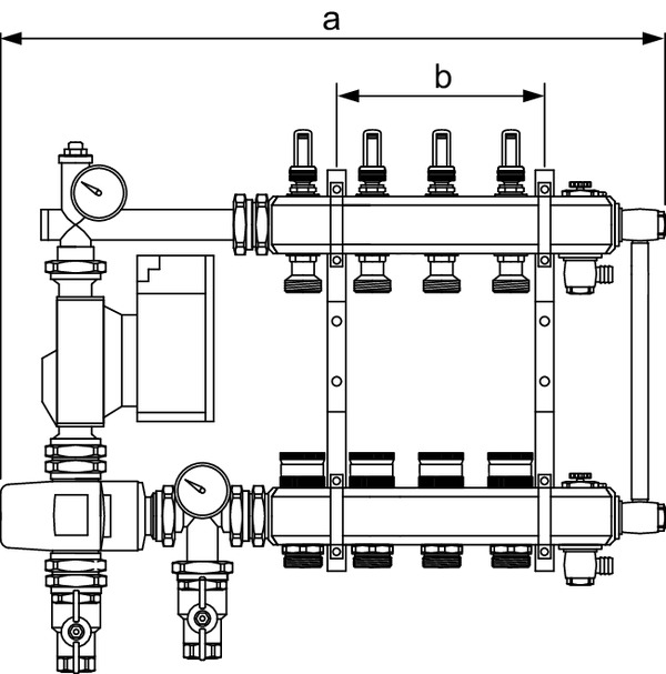 TECEfloor rozdzielacz ogrzewania podłogowego zintegrowany z termostatycznym zaworem trójdrogowym i mieszaczem pompowym (pompa elektroniczna)