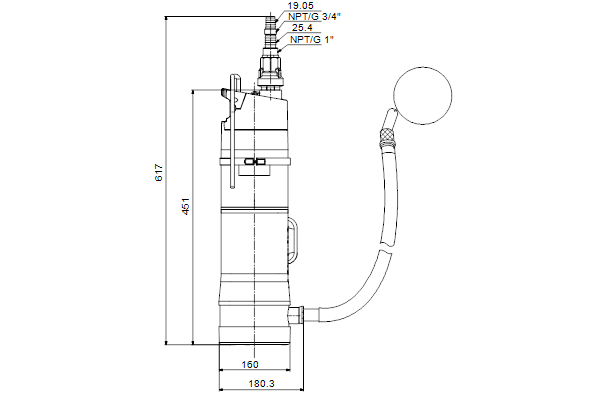 SB 3-35 AW jest wyposażony w kabel zasilający 15 m, a maksymalna głębokość instalacji wynosi poniżej poziomu wody, przy t