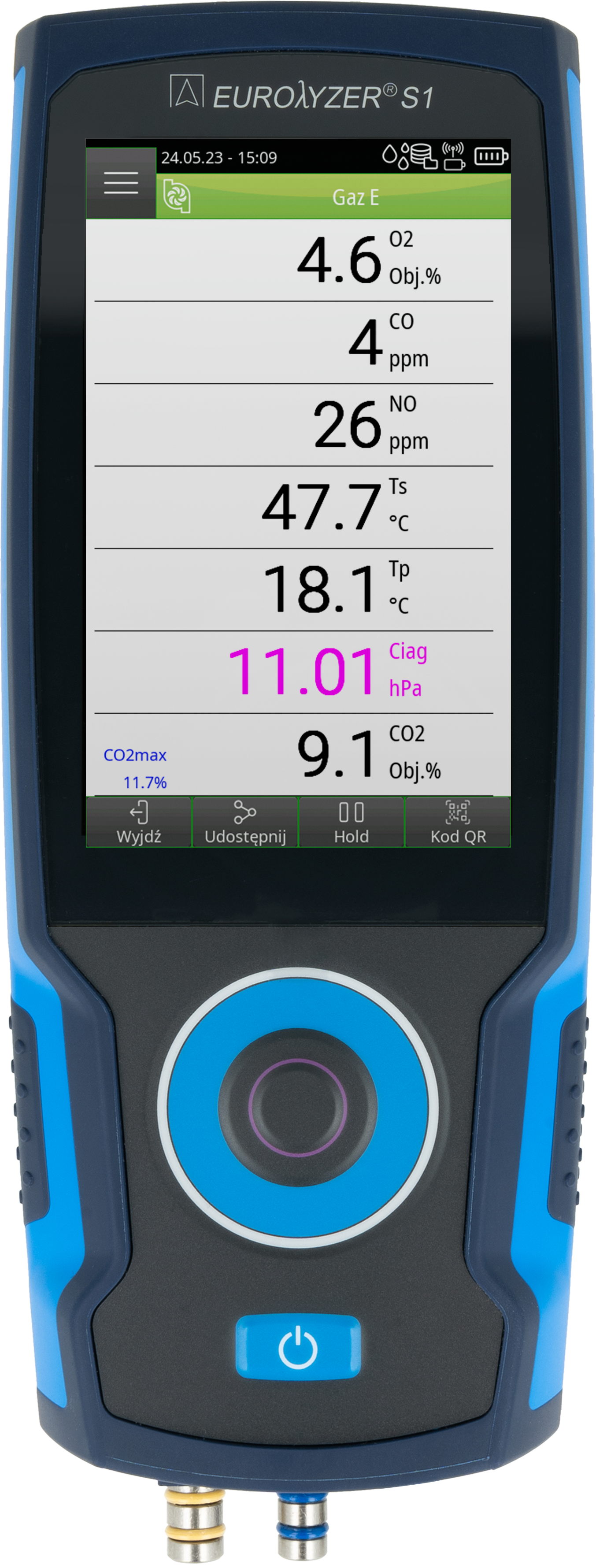 Parametry obliczane: CO nierozcieńczone, Lambda, CO2, sprawność (Eta), straty kominowe (qA), NOx, punkt rosy, różnica temperatur.