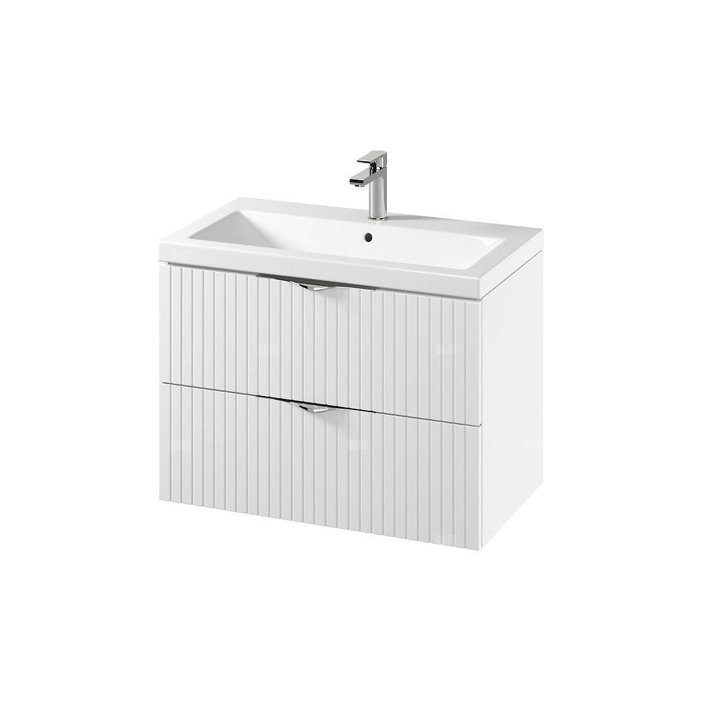 W skład zestawu wchodzi szafka podumywalkowa TIRSO 80 w wersji DSM oraz umywalka ceramiczna COMO 80. Szafka wyposażona w dwie pojemne szuflady z pełnym dnem, zapewniające więcej miejsca do przechowywania różnych akcesoriów łazienkowych - w związku z tym rekomendujemy zastosowanie syfonu oszczędzającego miejsce. Front szafki wykonany jest z ryflowanej płyty MDF foliowanej w matowej wersji, co nadaje jej subtelną fakturę i elegancki wygląd. Korpus szafki to płyta wiórowa laminowana, również w matowym wykończeniu. Prostokątna umywalka ceramiczna COMO 80 posiada otwór na armaturę i przelew w centralnej części, moze być skompletowana z korkami klik-klak ceramicznymi lub metalowymi z oferty Cersanit.