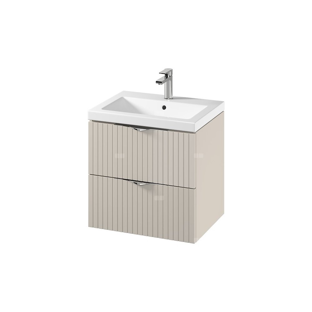 W skład zestawu wchodzi szafka podumywalkowa TIRSO 60 w wersji DSM oraz umywalka ceramiczna COMO 60. Szafka wyposażona w dwie pojemne szuflady z pełnym dnem, zapewniające więcej miejsca do przechowywania różnych akcesoriów łazienkowych - w związku z tym rekomendujemy zastosowanie syfonu oszczędzającego miejsce. Front szafki wykonany jest z ryflowanej płyty MDF foliowanej w matowej wersji, co nadaje jej subtelną fakturę i elegancki wygląd. Korpus szafki to płyta wiórowa laminowana, również w matowym wykończeniu. Prostokątna umywalka ceramiczna COMO 60 posiada otwór na armaturę i przelew w centralnej części, moze być skompletowana z korkami klik-klak ceramicznymi lub metalowymi z oferty Cersanit.