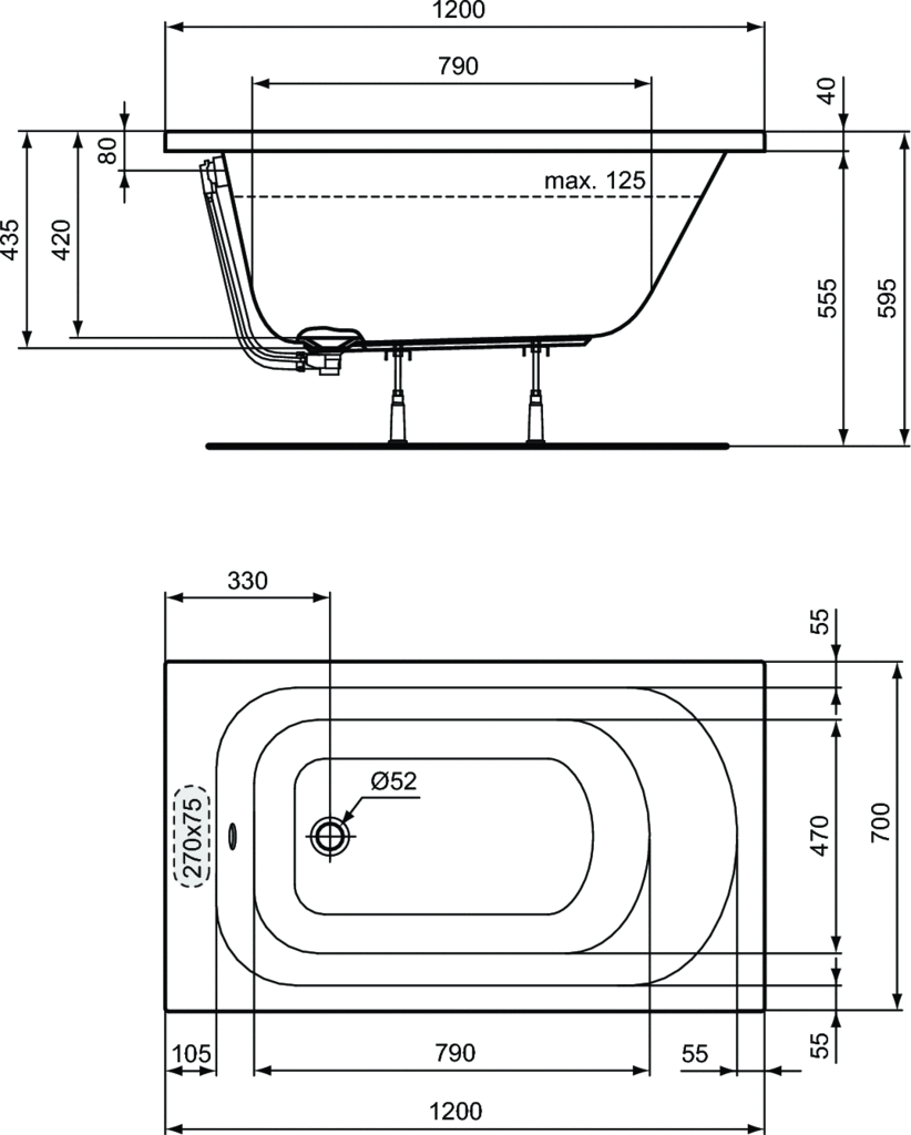 Wanna akrylowa Simplicity do zabudowy z bocznym otworem na syfon i przelew: Ø 52 mm. Wykonana z wysokiej jakości akrylu sanitarnego 3,2 mm z drewnianym wzmocnieniem konstrukcyjnym dna i krawędzi.