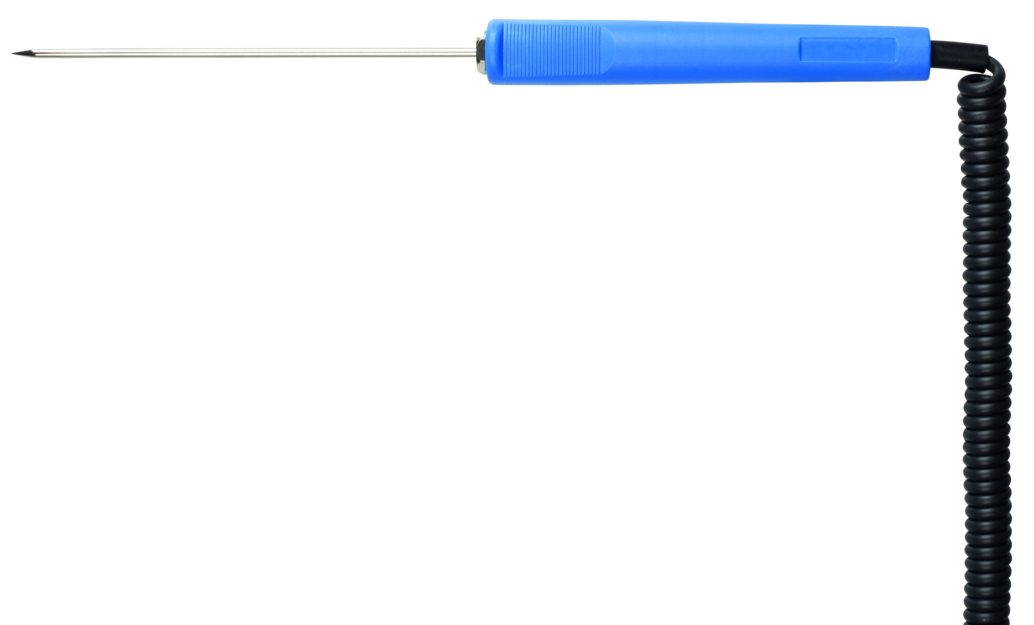 Czujnik temperatury igłowy X12 na przewodzie spiralnym z uniwersalną wtyczką typu K, służący do pomiaru temperatury mediów miękkich o maksymalnej temperaturze do 600°C.