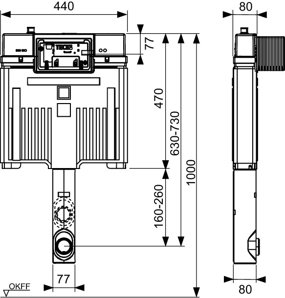 Spłuczka Octa II z instalacją przycisków spłukujących „easy fit” do toalety stojącej, głębokość 8 cm, do montażu w ścianie lub przed ścianą jednolitą.
