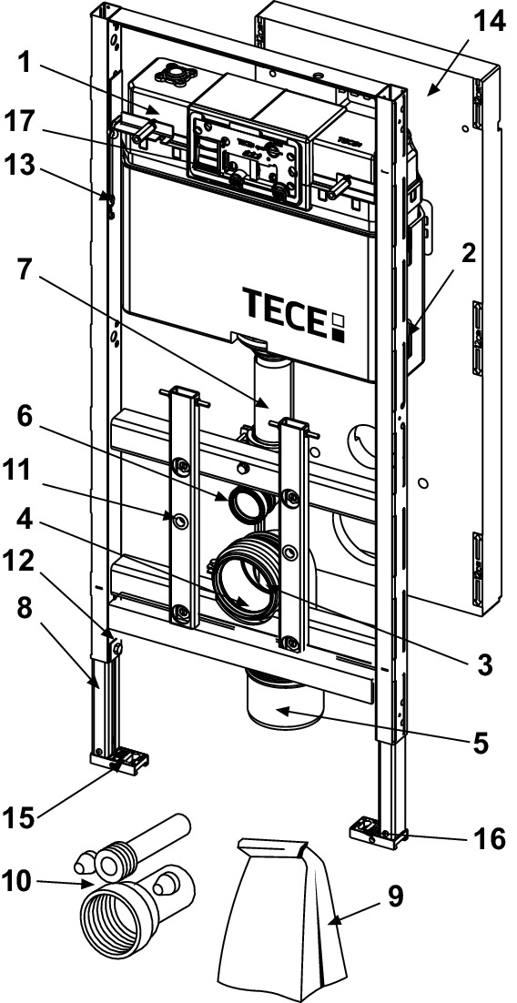 Podtynkowy moduł WC przeznaczony do montażu na kształtownikach stalowych TECEprofil lub do instalacji w ścianach z profili metalowych lub drewnianych oraz jako ścianka przednia lub stelaż narożnikowy.