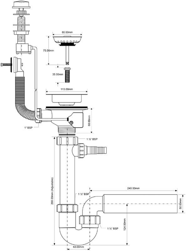 Syfon zlewozmywakowy rurowy 11/2"x50mm z podłączeniem do pralki lub zmywarki, ze spustem 113mm z korkiem automatycznym i przelewem z ujsciem prostokątnym.