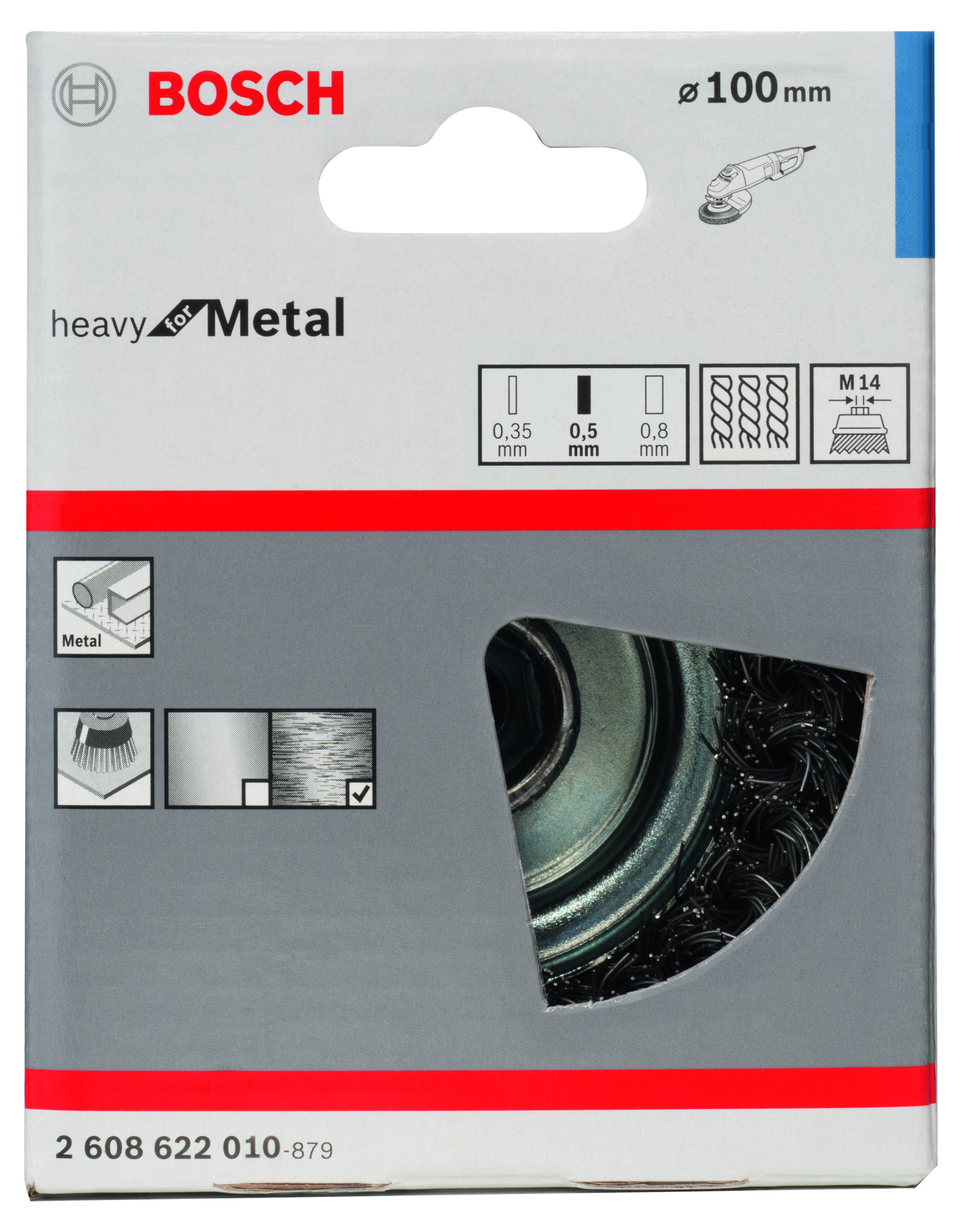 Tekst produktu, osprzęt szary Szczotka druciana garnkowa, drut pleciony Odpowiednia do wysokowydajnego czyszczenia od średnich do dużych powierzchni metalowych, np. usuwania silnej korozji, powłok antykorozyjnych, farb i lakierów. Odpowiednia do wszystkich szlifierek kątowych z gwintem M14 i szlifierek GGS 6 S Professional