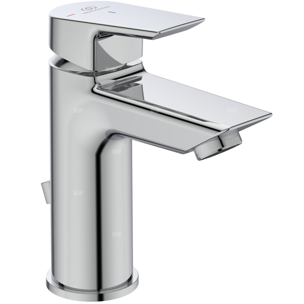 Bateria umywalkowa Tesi z metalowym automatycznym korkiem. Głowica ceramiczna IS 28 mm z ogranicznikiem temperatury. Mosiężny, odlewany korpus. Metalowy uchwyt z nadrukowanymi czerwonymi i niebieskimi oznaczeniami. Perlator typu Cascade z ogranicznikiem przepływu wody do 5 l/min. Wężyki przyłączeniowe G3/8".